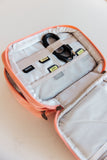 Stay organized on the go with the Travel Cord Organizer Case in Pink! This compact case, with a charming fabric body, is your solution for keeping tech accessories in check. Featuring two zipper compartments, multiple mesh pockets, and elastic grips, it's the perfect home for wires, charge plugs, cords, and more. Streamline your travel experience with this stylish and functional organizer.