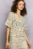 This V-neck short sleeve cardigan features a relaxed fit and intricate crochet detailing with varied weave patterns for added visual interest. The contrast star motifs and border detail add a touch of whimsy and charm. The front button closure offers versatility in styling and a secure fit. Perfect for layering over your favorite tops, this cardigan is a stylish and trendy addition to your wardrobe. Embrace the unique design of this cardigan for a chic and stylish look that stands out.