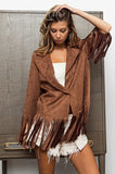 This stunning suede blazer combines classic tailoring with bohemian flair, featuring rich brown suede material that offers both luxury and comfort. The standout fringe detailing along the hemline and sleeves creates dynamic movement and visual interest. Designed with a traditional notched lapel collar and single-button closure, this blazer maintains professional sophistication while the tassel accents add playful texture. The oversized fit provides contemporary styling versatility, perfect for layering over casual or dressy outfits. Crafted from high-quality suede with meticulous attention to detail, this piece transitions seamlessly from day to night wear.