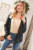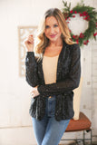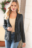 Just in time for season festivities, this black dequin front pocket open holiday jacket is a perfect layering piece to complement all your holiday ensembles. Unique and versatile, be ready to turn heads!