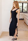 Make a big statement in the Not So Little Black Dress. Crafted from a lightweight ribbed sweater knit, it features a scooped neckline, sleeveless, side slits, and a fitted silhouette that falls to a maxi length. Look glamorous without sacrificing comfort and glide into any event with confidence.