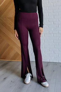 Strut your stuff in our Stamina Stride Flare Leggings! With a high waist and coin pocket for convenience, a thick waistband for support, and a center front leg seam for a sleek look, these leggings also feature a flare leg with front slit for added style. Made with brushed microfiber and high stretch, these leggings will keep you comfortable and looking fabulous.