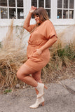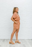 Walk the city streets in the Midtown Romper! We're totally in love with the soft caramel color, notched lapel that wraps over, and comfortable elastic waistband. Oh, and don't forget the pockets of course!