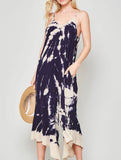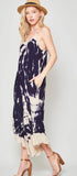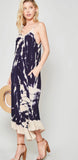 A woven jumpsuit in tie dye crepe fabric that features a loose fit, wide leg design with cropped length and asymmetrical hem. This tie dye jumpsuit also features a scoop neckline, low cut sides, adjustable cami straps, and side seam pockets. Model info: Heightb5’9” Bust: 34” Hips: 34” wearing size small