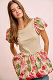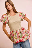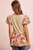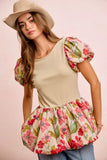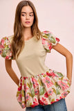 BiBi Floral Printed Bubble Sleeves and Hem Peplum Top