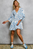 This mini dress features a charming floral print, perfect for adding a touch of bohemian flair to your wardrobe. The ruffle sleeves and V-neckline create a flattering and feminine silhouette. Made from lightweight and breathable fabric, this dress is ideal for warm weather. The relaxed fit ensures comfort and ease of movement. Perfect for casual outings, beach days, or summer parties.