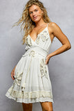 The V-neck sleeveless short dress in soft viscose is adorned with intricate embroidery, tassels, and sequins, adding a touch of elegance and charm. The emphasized smocked waist enhances the silhouette, while lace-ruffle accents and reverse ruffle detailing lend a romantic flair. Finished in a solid color and lined for comfort, this dress exudes a feminine and effortlessly charming style. Elevate your look with this beautiful and comfortable dress that combines exquisite detailing with a flattering fit. Embrace the feminine and charming appeal of this V-neck dress, perfect for making a stylish statement with ease and grace.