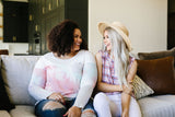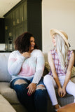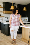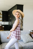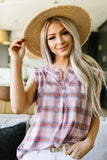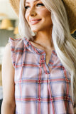 I was surprised to find that this pretty pink plaid top is made from a soft and stretchy knit! I thought it might be woven and therefore not as comfortable. So here’s to pleasant surprises and to this adorable top with its placket V, darling ruffles at the shoulders, and knit fabric!