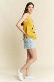 This cheerful Jade By Jane tank top features a bold black smiley face graphic on soft, lightweight cotton-blend fabric in a vibrant mustard yellow. The relaxed fit silhouette is enhanced by a playful fringe hem detail that adds movement and bohemian flair. Perfect for summer festivals, beach days, or casual outings, this versatile piece pairs effortlessly with denim shorts, skirts, or layered over swimwear. The comfortable scoop neckline and sleeveless design ensure all-day comfort in warm weather.