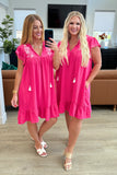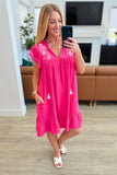 Turn heads in this playful Carnival Flutter Sleeve Dress in hot pink! Made from crinkle woven fabric, it features a flattering v-neckline and a functional tasseled neck tie. Plus, you'll love the practicality of the functional side pockets. With charming flutter sleeves and delicate machine embroidered details, this dress is the perfect mix of fun and function. (But seriously, how cute are those embroidered details?!)