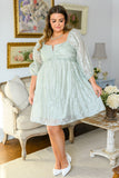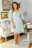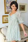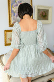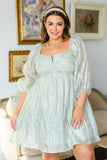 Embrace the fairy tale in your heart this season in the Spotting Fairies Puff Sleeve Dress In Sage! This stunning dress features a floral jacquard, organza fabric that shapes a notched sweetheart neckline with puff sleeves ending at elbow length, finished with elastic cuffs. The mini length skirt ends at the knee with a babydoll silhouette.