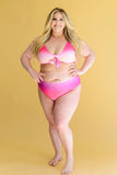 Slip into our vibrant Jamaica Ombre Two Piece Swimsuit and you'll instantly feel a sunny vibes coming your way! This eye-catching set features a dreamy ombre design, removable cups, and a decorative tie that gives it a touch of beachy chic. The v-neck bikini top, mid-rise fit and cheeky bottom are fully lined for a comfy and confident fit like no other. Get ready to make waves!