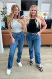 Effortlessly step up your denim game with our Campbell High Rise Seam Detail Straight Jeans from Judy Blue. Featuring a flattering high rise fit and a classic dark wash, these jeans also include center front and back seam details for an added touch of style. The straight leg silhouette is versatile and can be worn with an optional cuffed hem for a chic look. Plus, our non-distressed denim ensures a polished appearance. Upgrade your wardrobe with these timeless jeans that offer both fashion and comfort.