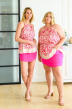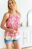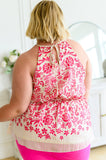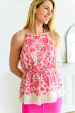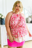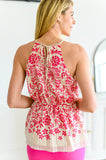 Look and feel amazing in this Fantastic Filigree Peplum Blouse! Adorned with a halter neckline and subtle sheen, this blouse is sure to make a stunning fashion statement. Comprised of a layered sheer striped fabric with a bright print, the peplum silhouette adds a delightful, feminine touch.