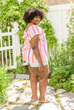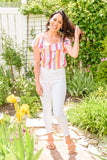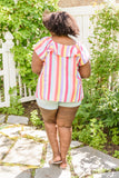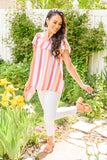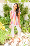 You know it's time for the It's Electric Striped Shirt when that summer sun comes out! We can't get over these fun colors that come together to create a vertical striped pattern, a square neckline, ruffle overlay and flounce short sleeves.