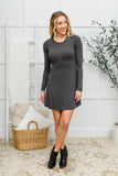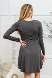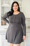 This long sleeve dress features a lightweight stretchy fabric that shapes a round neckline with long sleeves and a loose fit body with a hi-low hem. Functional wooden buttons decorate the neckline for a fun look!