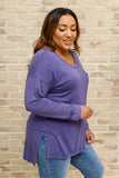 The Long Sleeve Knit Top With Pocket In Denim Blue features a lightweight, stretchy fabric that shapes a round neckline with long sleeves, and a hi-low hem with side slits. A chest patch pocket decorates a loose fit bodice for a comfortable and stylish look.