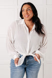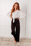 Experience effortless style with our Pause and Reflect Tie Front Button Up Shirt. Made from crinkle woven fabric, this shirt features a collared neckline, a full button closure, and a waist tie for a flattering fit. The cropped design and scooped hem add a playful touch, while the balloon sleeves with banded and buttoned cuffs add a unique twist to this wardrobe must-have.