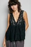 The delicate lace sleeveless top exudes an elegant and feminine charm with its relaxed, flowy silhouette and deep V-neckline. The scalloped lace trim adds a touch of sophistication to the design. Featuring a softly tiered bodice and intricate lace detailing, this top showcases intricate craftsmanship and attention to detail. Its lightweight drape enhances its graceful movement and adds to its overall elegance. Perfect for layering or wearing on its own, this top is a versatile and chic option for various occasions.