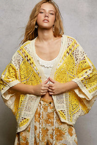 This open cardigan is designed with 3/4 batwing sleeves and a roomy fit, featuring intricate crochet work with a variety of weave patterns that create a visually appealing texture. The scalloped edge adds a touch of elegance and detail to the overall design. Perfect for layering over any outfit, this cardigan offers a bohemian-chic vibe that exudes effortless style. Embrace the unique craftsmanship and attention to detail in the crochet work of this cardigan for a standout look. Elevate your wardrobe with this statement piece that combines comfort and fashion in one.