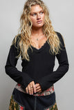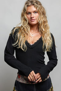 POL V-Neck Long Sleeve Ribbed Top with Lace-Accent Neckband