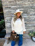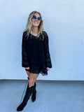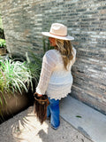 This sheer lacy top is perfect mix of boho and elegance! Features tiered ruched lace (that has slight stretch). Wrists have a stretchy elastic band and neckline is a slight V neck. Paired with a cami underneath (cami not included!)