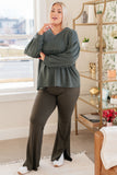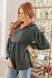 Stay effortlessly stylish with our She's Not Wrong Hooded V-Neck Pullover. Made of cozy French terry, this pullover features a flattering hooded V-neckline, a gathered peplum, and playful balloon sleeves. Perfect for a casual yet chic look.