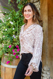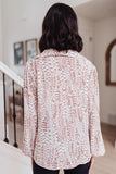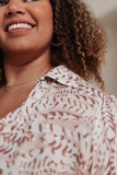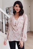 The Take Flight Cowl Neck Top is a stunning statement piece! The deep cowl neckline and soft bishop sleeve give this top such a fun shape. The abstract print has a gold sparkle detail throughout that we LOVE! Pair this top with dark skinny jeans or work trousers.