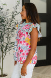 Elevate your style with this playful floral blouse featuring a high ruffled neckline and layered flutter sleeves that add a flirty touch. Crafted from soft poplin woven fabric, it offers comfortable wear with charming ruffle details throughout. The button keyhole closure at the back adds a sweet finishing detail, making this blouse perfect for days when you’re feeling too fab to care.