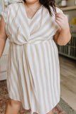 Look stunning in this Twisted and Tailored Striped Dress! Featuring a woven stripe, knotted front, and deep v-neckline, this flattering dress is sure to turn heads. Its cap sleeves, faux wrap skirt, and elastic waistband further accentuate your figure for a beautiful silhouette.